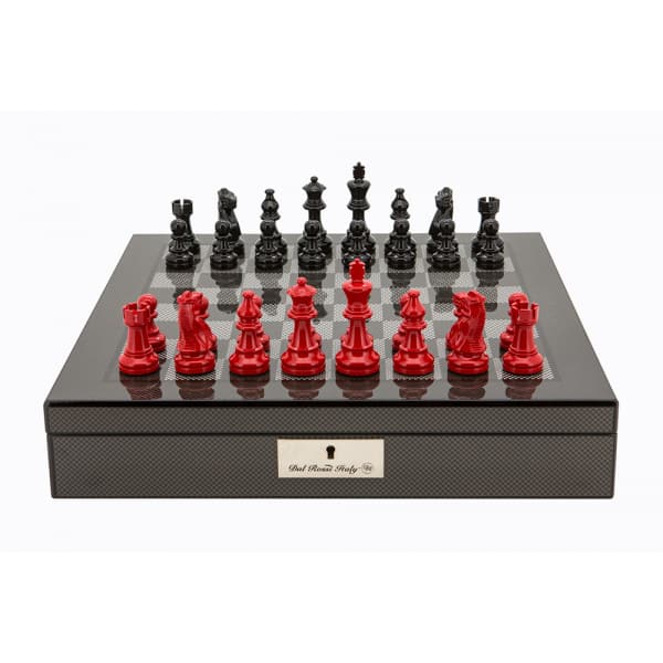 Dal Rossi Italy Carbon Fibre Shiny Finish chess box with compartments 16” With French Lardy Black/Red 85mm Chessmen