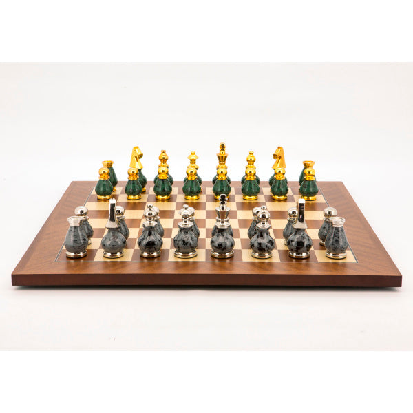 Dal Rossi Italy Chess Set Palisander / Maple Flat Board 40cm, With Gray and Green Gold and Silver Metal Tops and Bottoms Chess Pieces 90mm