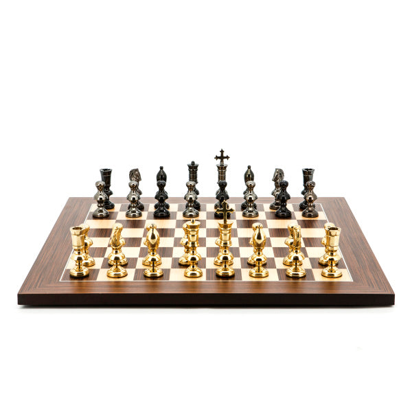 Dal Rossi Italy Chess Set Palisander / Maple Flat Board 50cm, With Metal Dark Titanium and Gold Chessmen 110mm