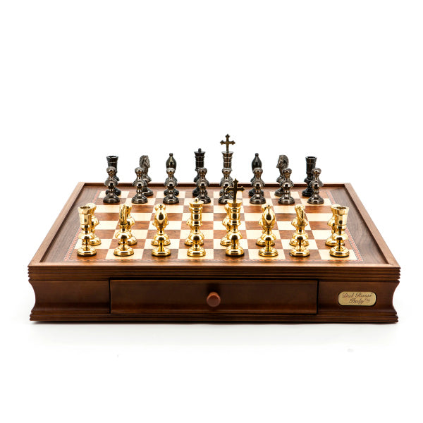 Dal Rossi Italy Chess Set Walnut Finish 20″ With Two Drawers, With Metal Dark Titanium and Gold Chessmen 110mm