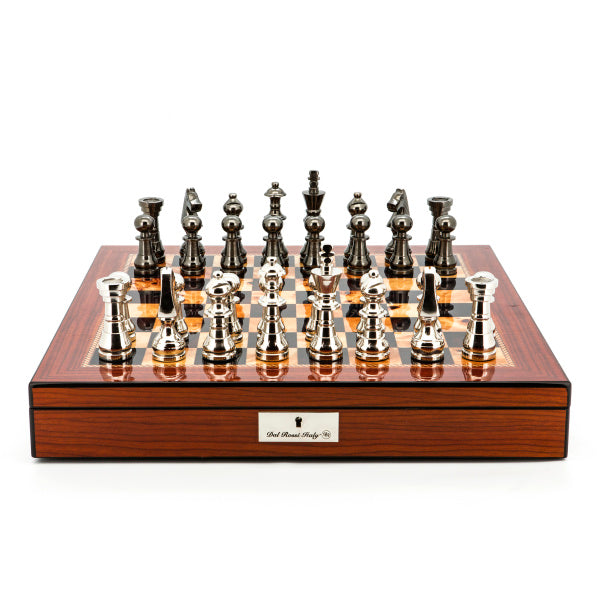 Dal Rossi Italy Chess Set Walnut Shinny Finish 20″ With Compartments, With Metal Dark Titanium and Silver chessmen 115mm