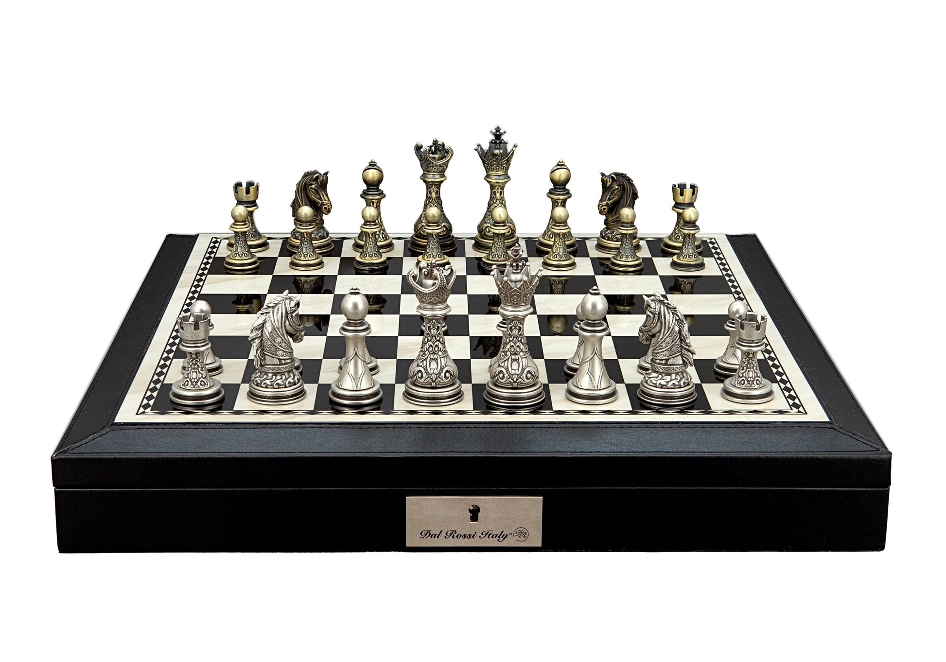 Dal Rossi Italy Chess Set with Black and White PU Leather Bevelled Edge chess box with compartments 18″ and Regal Copper and Silver 90mm Chess Pieces