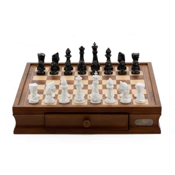 Dal Rossi Italy Chess Set with Diamond-Cut Black & White 85mm chessmen on a Walnut Finish Chess Box 16” with drawers